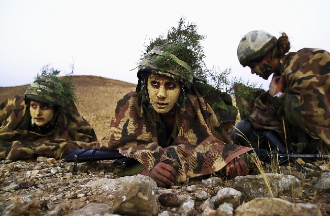 当地时间2005年3月23日,以色列,脸上涂着泥巴、头上戴着伪装头盔的以色列女兵。