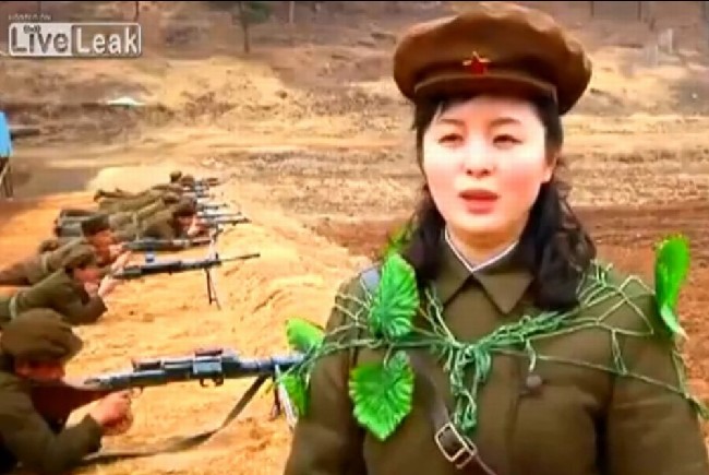 2013年3月,朝鲜方面公布了一组朝鲜人民军训练的视频,展现了朝鲜人民军高昂的斗志。视频中,有多名朝鲜士兵身着“伪装服”亮相。而这伪装服的主要材料,居然是塑料制成的假花草,而且颜色非常鲜艳,这与尚处于冬末春初的朝鲜山区枯黄的色调格格不入。