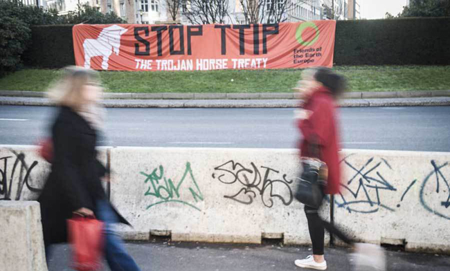 当地时间2015年2月4日,比利时布鲁塞尔,“欧洲地球之友”组织的成员在欧盟总部前竖起了一只充气的巨型特洛伊木马,以抗议“跨大西洋贸易与投资伙伴协议”。(图片:东方IC)