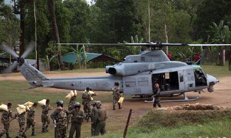 5月13日消息,一架执行震后救援行动的美军UH-1Y“休伊”型直升机12日在尼泊尔扎瑞科特地区附近失联,事发时机上共载有8人。图为当地时间5月11日,一架美军UH-1Y“休伊”型直升机在尼泊尔辛杜利地区参与救援行动。