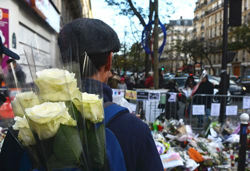 11月22日,一名男子在法国巴黎伏尔泰大街一处街口悼念罹难者。新华社记者 李根兴 摄