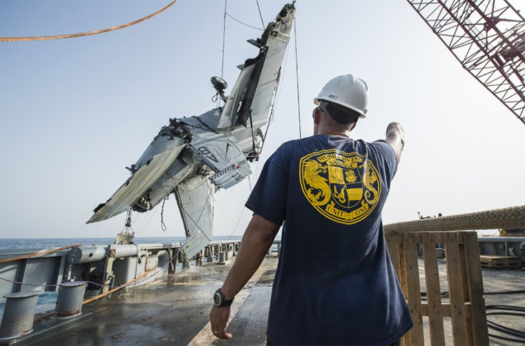 近日,美国网络媒体披露了2015年7月22日拍摄的一组照片,展示了美国海军“卡托巴”号舰队远洋拖船打捞因机械故障坠入阿拉伯海的F/A-18F“超级大黄蜂”战斗机的场景。