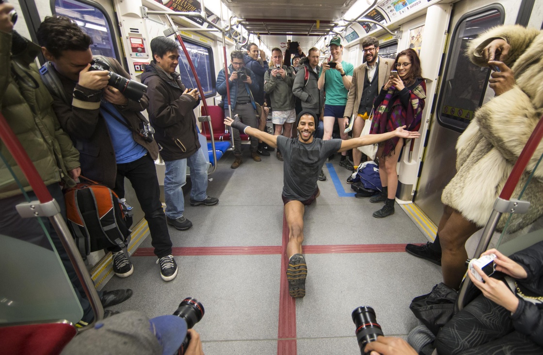 1月10日,在加拿大多伦多,一名未穿外裤的乘客(中)在地铁车厢内表演。当日,加拿大多伦多举行2016年“不穿裤子搭地铁”活动,吸引了众多年轻人参与。 新华社发(邹峥 摄)
