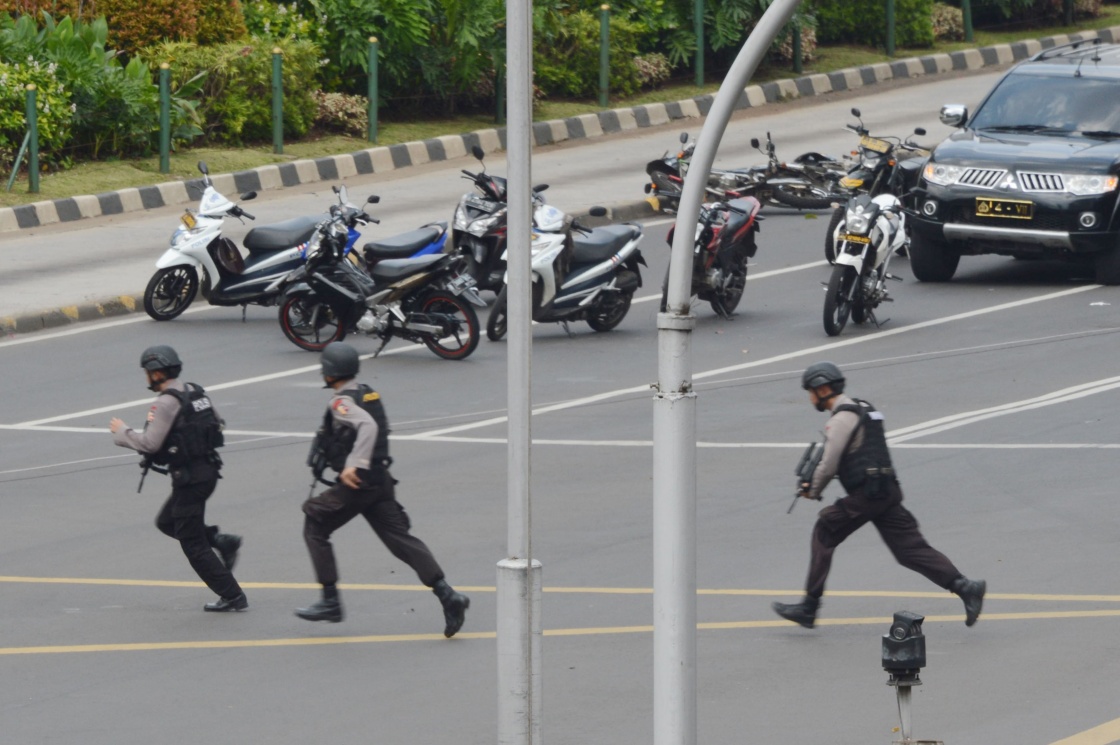 1月14日,在印度尼西亚首都雅加达,警察赶到爆炸现场。 新华社/法新