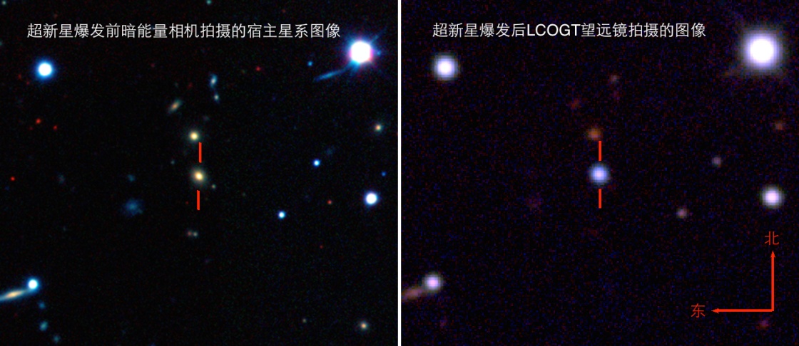 图为北京大学科维理天文与天体物理研究所提供、由本杰明·夏皮和ASAS-SN团队制作的超新星爆发前(左)和爆发后(右)的伪彩色图像。左图是4米望远镜上的暗能量相机拍摄。右图是1米LCOGT望远镜网络拍摄。