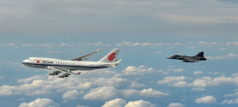 此次习主席访捷,两架JAS-39“鹰狮”战机全程护航。JAS-39“鹰狮”战机为捷克空军主力机型,在多功能战斗机家族中极具代表性。专机进入捷克领空后,战机从专机侧后方缓慢接近,保持相同速度在专机可视空域伴随飞行。为表达对习主席到访的欢迎,护航战机伴飞一段时间后,开始抵近飞行,距离缩短至几百米甚至几十米范围内。透过舷窗上,机上人员可以清晰地看到“鹰狮”战机的电子战吊舱和近距耦合鸭式布局。护航飞机一左一右,与专机成倒“V”型,十分优雅。当习主席专机到达布拉格时,护航战机的位置由后侧变为前侧,引导习主席专机进入机场降落线。待专机降落后,战机从机场上空通场飞过,表示任务圆满完成。