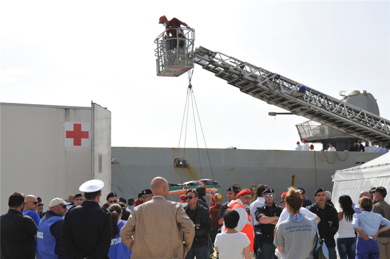 5月29日,在意大利雷焦卡拉布里亚,一艘载有600多名难民的意大利海军舰船卸下一具难民的尸体。