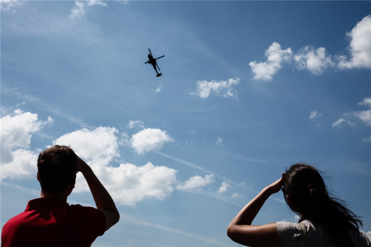 6月3日,在德国柏林,游客观看一架“阿帕奇”武装直升飞机表演飞行特技。新华社记者张帆摄