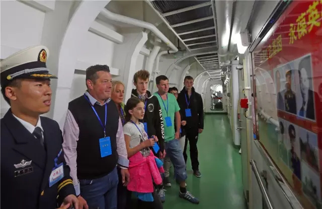 民众在湘潭舰“传承红色基因”展示橱窗前驻足观看。钱宏 摄