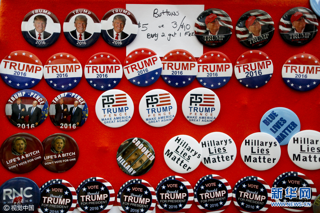 为期4天的共和党全国代表大会将于美国时间21日落下帷幕,特朗普当晚将发表重大政策演讲,为其竞选总统定调。图为当地时间2016年7月20日,美国俄亥俄州克利夫兰,共和党全国代表大会举行至第三日,特朗普纪念品热销。