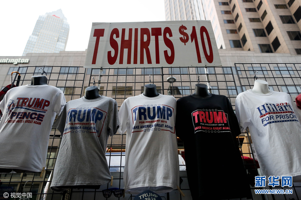为期4天的共和党全国代表大会将于美国时间21日落下帷幕,特朗普当晚将发表重大政策演讲,为其竞选总统定调。图为当地时间2016年7月20日,美国俄亥俄州克利夫兰,共和党全国代表大会举行至第三日,特朗普纪念品热销。