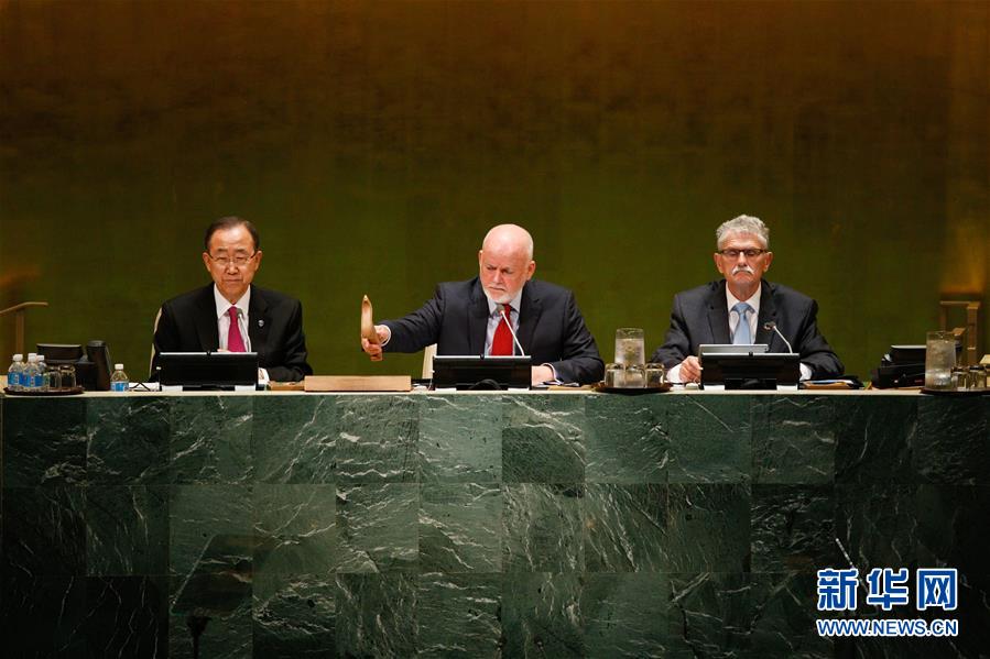9月19日,在美国纽约联合国总部联大解决难移民大规模流动问题高级别会议上,第71届联大主席彼得·汤姆森(中)宣布通过政治宣言。