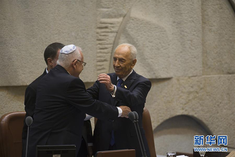这是2014年7月24日,在耶路撒冷的以色列议会,即将卸任以色列总统的佩雷斯(右)在新总统鲁文·里夫林(左)的宣誓就职仪式上致意。新华社发(罗嫩·祖伦摄)