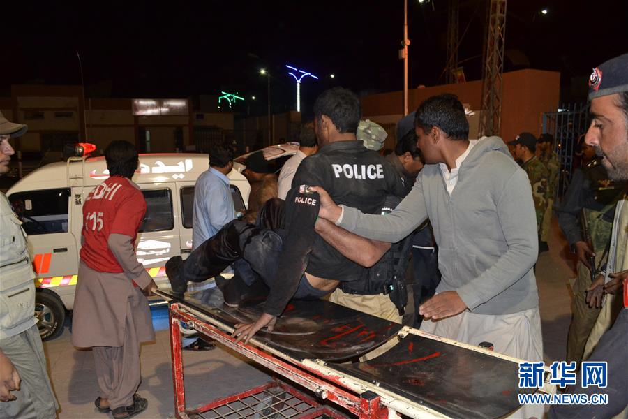 10月24日,在巴基斯坦奎达,人们将一名受伤人员转移至医院。据巴基斯坦官方和媒体10月25日消息,该国西南部俾路支省首府奎达的一所警察培训学院24日晚遭不明身份武装分子袭击,造成至少20人受伤,另有至少200名受训警察被劫为人质。新华社发(阿萨德摄)