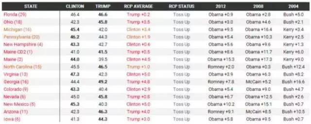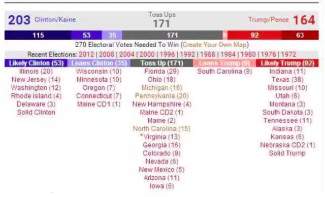 总体而言,川普要赢还是挺难的,除了要拿下一直在摇摆在佛罗里达、俄亥俄之外,必须撬开本来偏蓝的北卡,以及宾州或密歇根中的一个,才能凑够270张选举人票。RCP的预测口径有点大,把5%以内的差距都算成摇摆州了。