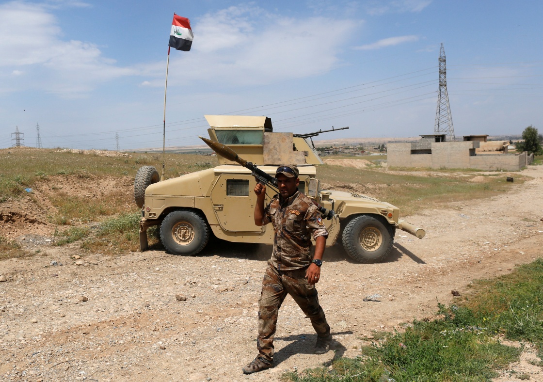 5月5日,在伊拉克摩苏尔西北部,一名安全部队士兵从军车旁走过。 新华社/路透