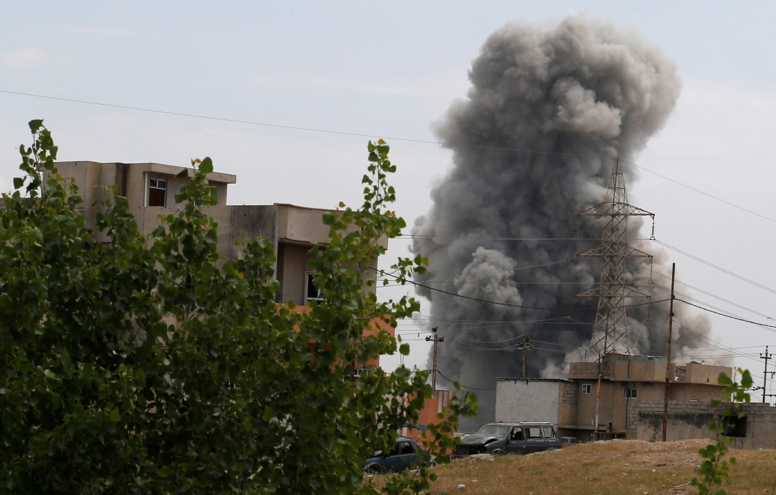 5月5日,在伊拉克摩苏尔西北部,一处遭空袭地点升起浓烟。 新华社/路透