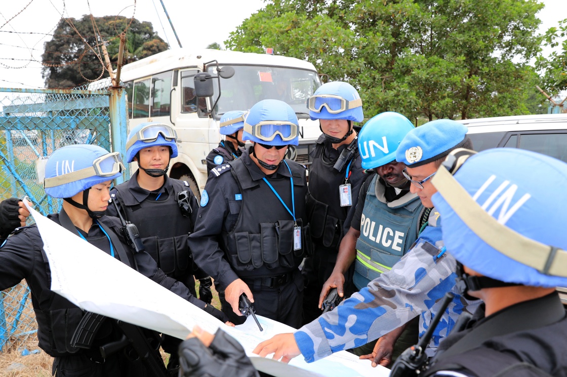 8月22日,在利比里亚大巴萨州,中国维和警察防暴队成员与联合国驻利比里亚特派团官员、尼日利亚维和警察防暴队成员确定巡逻行进路线。新华社发(赵小新摄)