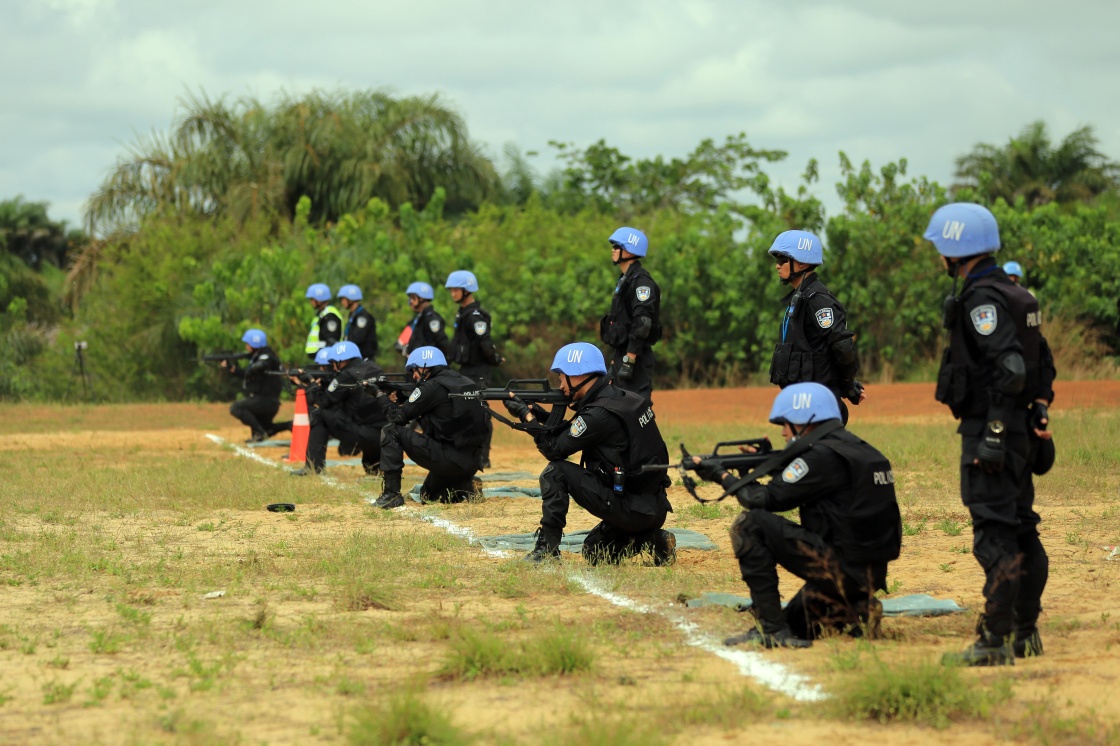 中国第五支驻利比里亚维和警察防暴队22日在利比里亚首次组织实弹射击训练。这是中国维和警察防暴队根据联合国2017年3月发布的《防暴队政策》开展的实弹射击训练。新华社发(赵小新摄)