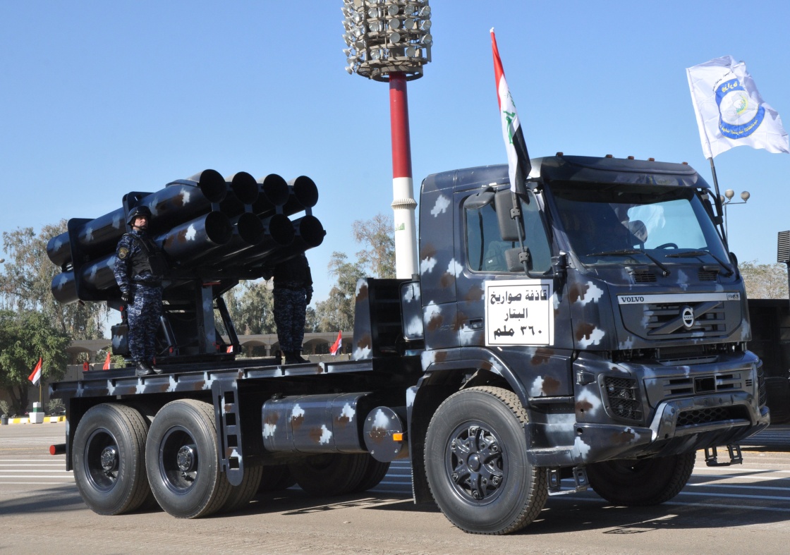 在伊拉克巴格达“绿区”,一辆警用武装车辆通过检阅广场。