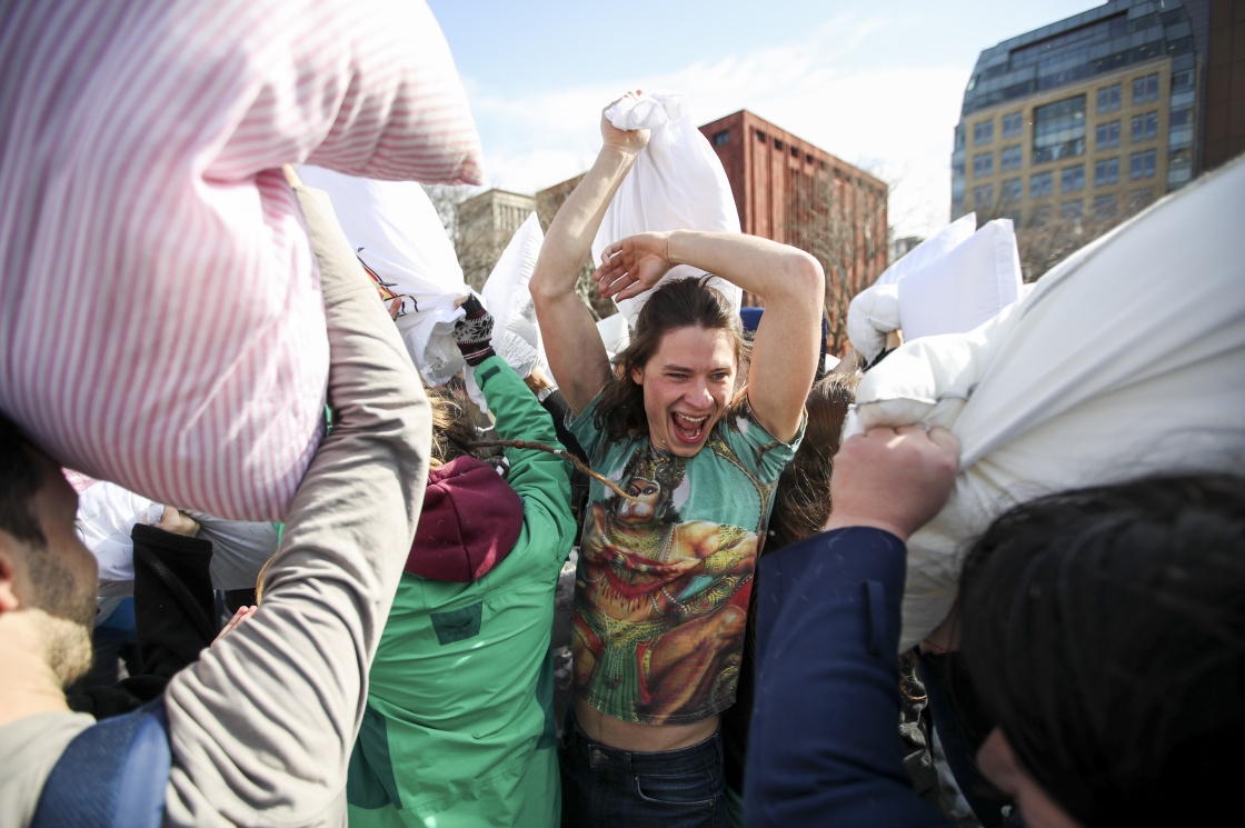 4月7日,在美国纽约,人们参加“枕头大战”。 新华社记者王迎摄