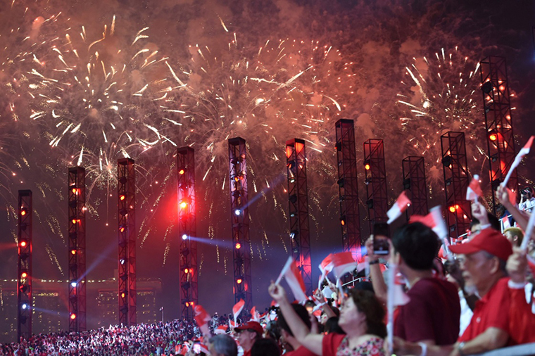 8月9日,人们在新加坡举行的国庆庆典上观看烟花。