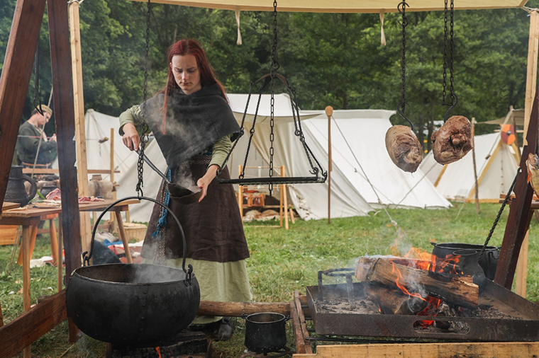 8月10日,在比利时布永,一名女子在中世纪风情节上准备食物。