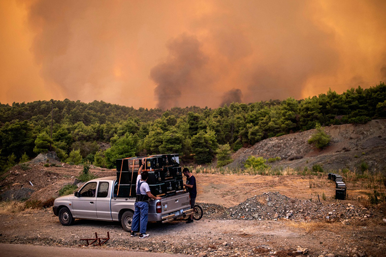 8月13日,在希腊中部埃维亚岛,当地居民转移蜂箱。
