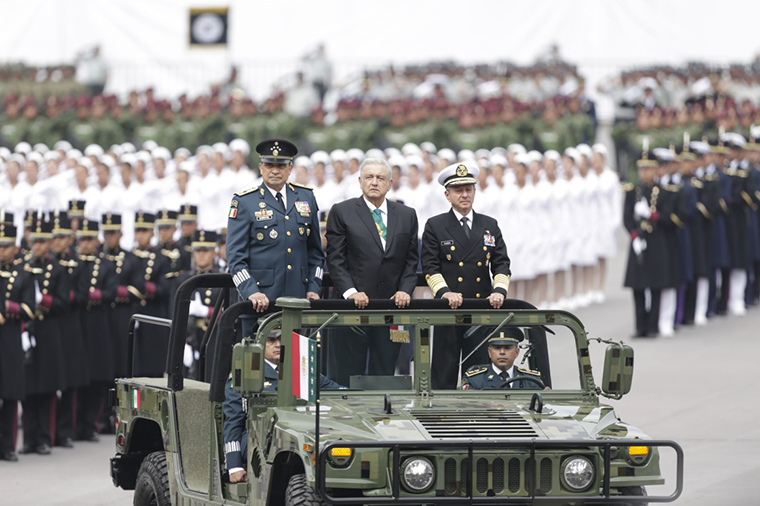 9月16日,在墨西哥首都墨西哥城,墨西哥总统洛佩斯(中)参加独立日阅兵。