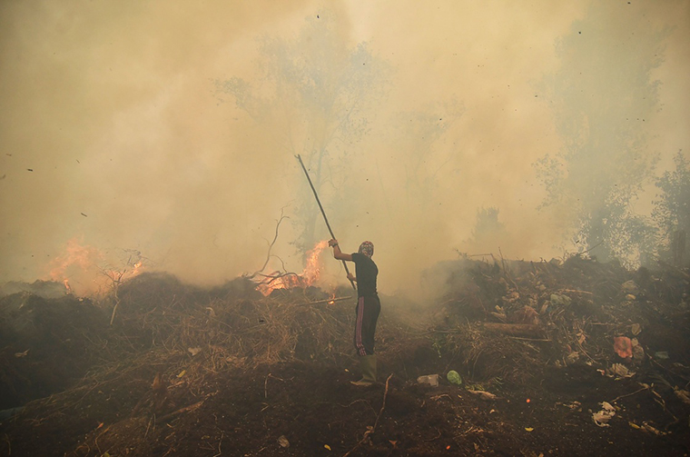 9月22日,在印尼廖内省一个村庄,村民试图扑灭山火。