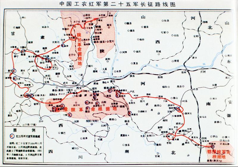 中国工农红军第25军长征线路图。1934年11月16日从河南罗山县开始长征,1935年9月15日到达陕北延川县永坪镇,胜利结束长征