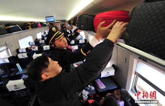 1月22日,由“80后、90后”为主组成的高铁男子乘务组出现在G69高铁列车上。据石家庄客运段介绍,高铁乘务员一般都为女性,而该乘务组由清一色的小伙子组成,身高1.78至1.81米,平均年龄25岁;个个阳光帅气,且都会针线活,为北京铁路局首个高铁男子乘务组。图为乘务长为旅客码放行李。中新社发 翟羽佳 摄