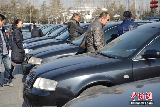 1月26日,竞标的买家在看车况。当日,内蒙古呼和浩特首批19辆超标公务车公开拍卖,19辆车全部为奥迪汽车。最高成交价为一台已行驶7万4千多公里的FV7201TFCVTG奥迪车,起拍价17万,成交价28.1万元;最低成交价为一台已行驶34万多公里的A6L1.8TAT奥迪车,起拍价2万,成交价6.6万元。中新社发 刘文华 摄