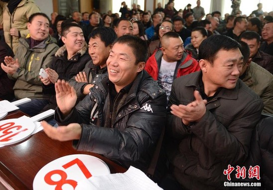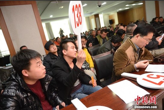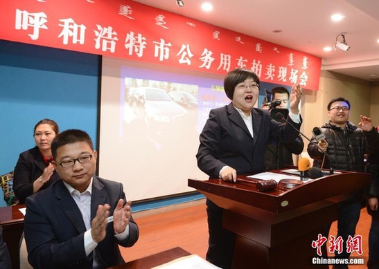 1月26日,拍卖会现场,一位竞拍买家多次举牌,引起其他买家掌声。当日,内蒙古呼和浩特首批19辆超标公务车公开拍卖,19辆车全部为奥迪汽车。最高成交价为一台已行驶7万4千多公里的FV7201TFCVTG奥迪车,起拍价17万,成交价28.1万元;最低成交价为一台已行驶34万多公里的A6L1.8TAT奥迪车,起拍价2万,成交价6.6万元。中新社发 刘文华 摄