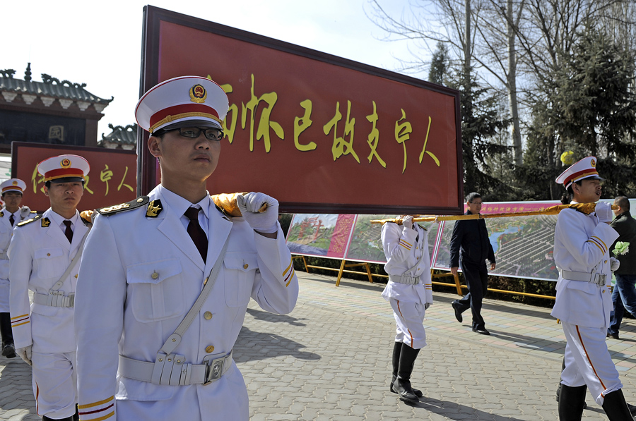 3月29日,在宁夏银川市松鹤陵园,礼仪队员在巡园。新华社记者 李然 摄