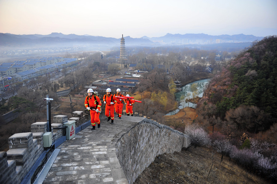 3月29日,河北承德消防避暑山庄中队官兵在避暑山庄城墙上进行防火巡查。新华社发 王立群 摄