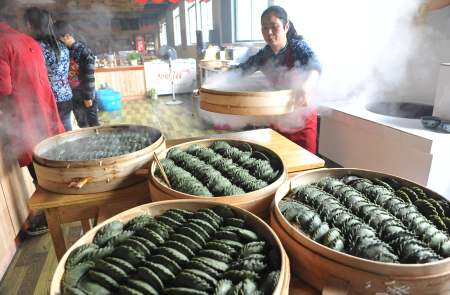 3月30日,浙江省临安市一家特色食品店的员工将蒸熟的“清明果”起笼。新华社发 胡剑欢 摄