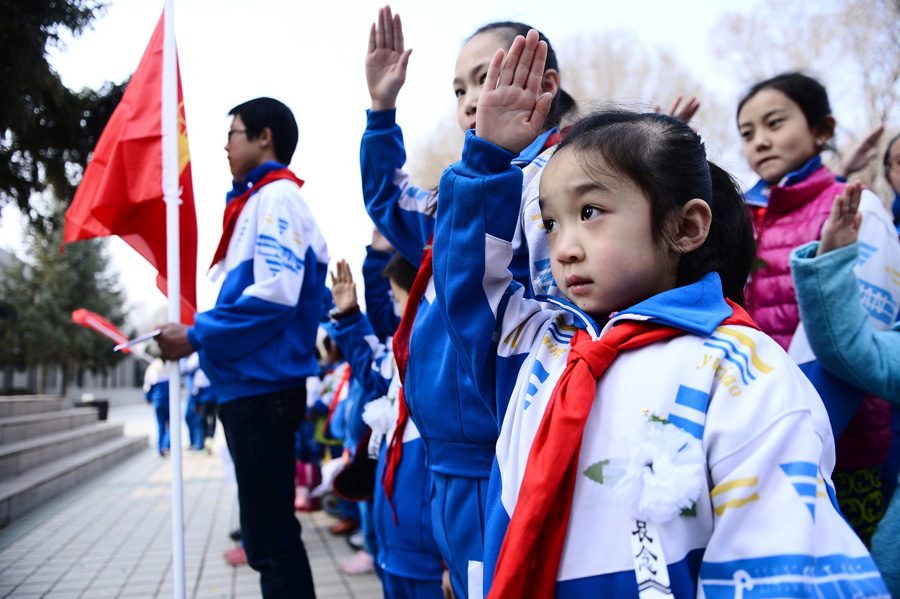 4月1日,西宁市玉井巷小学学生向中国工农红军西路军纪念碑行礼。新华社记者 张宏祥 摄