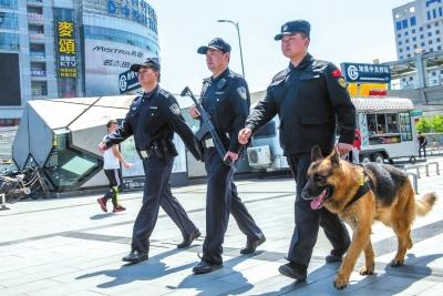 民警持枪配犬巡逻。京华时报记者蒲东峰摄