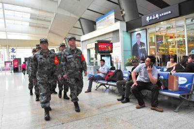 民兵在北京南站候车大厅内巡逻执勤。京华时报记者赵思衡摄