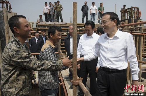 5月22日,在赤峰污水处理项目工地,李克强走上脚手架与农民工交谈。他说,你们为城市地上工程贡献了力量,现在又做地下工程,为长久发展打基础,你们是城市建设的双功臣。城市地下设施历史欠账多,未来要做更多地下工程,你们把这方面的技术学好,将来会有更多活干!