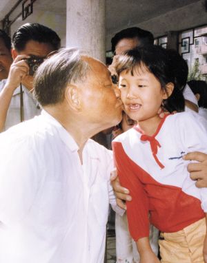 邓小平同志视察红桥区居民小区时亲吻在这里游玩的孩子。
