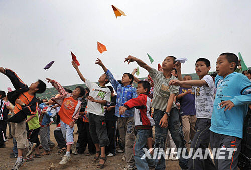 2008年5月31日,四川省绵竹市东北镇天齐村天河海军小学的学生在操场上放飞自己折叠的纸飞机。 “六一”儿童节来临之前,四川省绵竹市东北镇天齐村天河海军小学的孩子们把写上自己愿望和梦想的纸张折叠成纸飞机,并在操场上放飞。 新华社记者 郝同前 摄