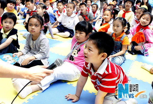 2010年6月1日,小游客在瑞典馆内的儿童节庆祝活动中参与互动游戏。“六一”国际儿童节当天,上海世博园区的多个场馆为小游客们准备了丰富多彩的活动,这些地方充满天真童趣,仿佛成了儿童嘉年华乐园。新华社记者刘颖摄