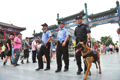 今年以来,为加强首都反恐防恐和社会治安秩序防控工作,市公安局统一部署,调集民警训导员80名、警犬80余只,在中心城区的天安门及公交车站、火车站、市场、步行街等人员密集的繁华地段,开展民警携犬巡逻工作。