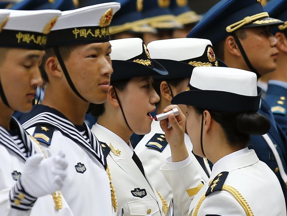 组图:幕后的三军仪仗队 女兵典礼前悄悄补妆