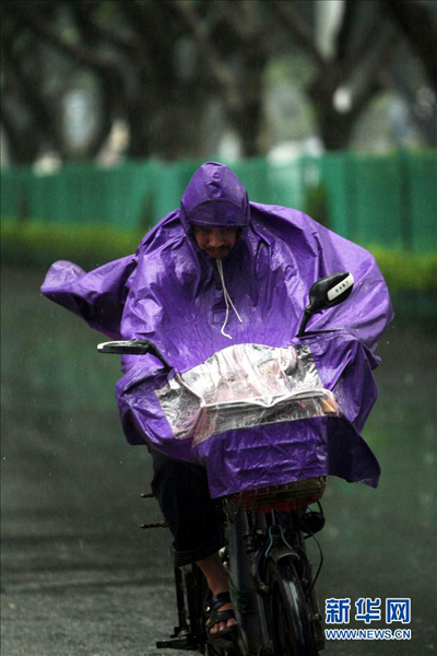 6月15日,受台风“海贝思”影响,厦门遭遇暴雨天气,一名市民冒雨在思明区湖滨北路骑行。今年以来登陆我国的首个台风“海贝思”当日下午在广东省汕头市濠江区沿海登陆。新华社发(曾德猛 摄)