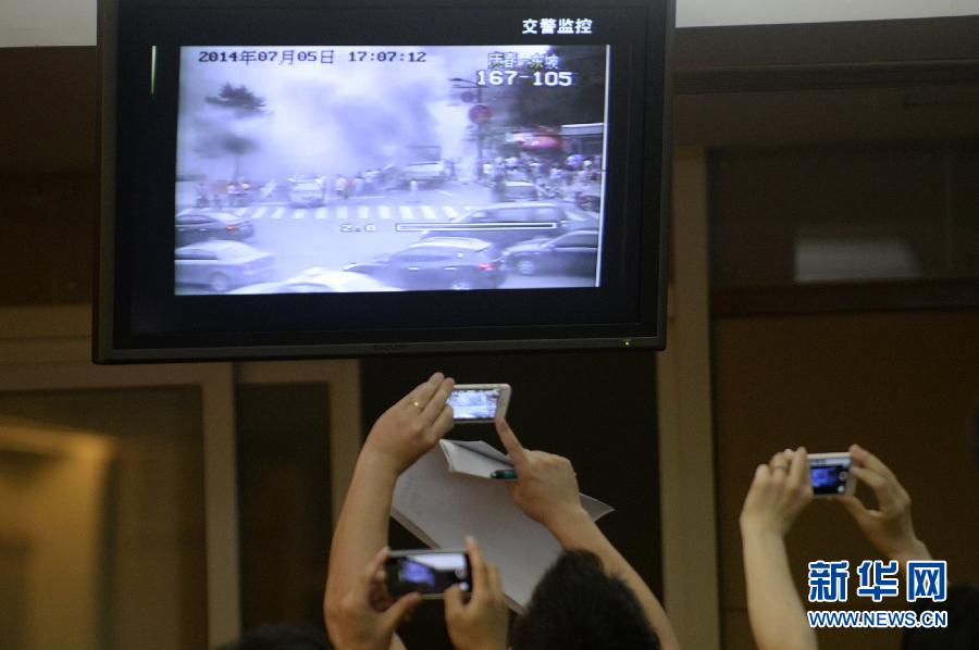 资料图:7月6日,记者在新闻发布会现场拍摄交警监控拍摄的杭州“7·5”公交车放火案的监控画面。新华社记者 鞠焕宗 摄