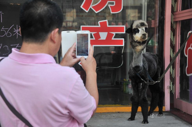 2014年7月23日下午,沈阳市皇姑区华山路附近一家店门前拴着一只黑色羊驼。羊驼的主人王女士给它起了个昵称叫“黑妞”。