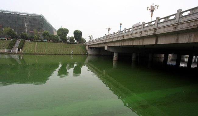 2014年8月10日,江西省九江市的景观河——横穿庐山区的十里河,从慧龙新城小区至九江仪表厂约1公里的河道内,河水变成了粘稠的绿漆一样的颜色,河水的绿色可与护坡上青草的绿色相“媲美”,远看几乎分不清哪是河水,哪是青草。
